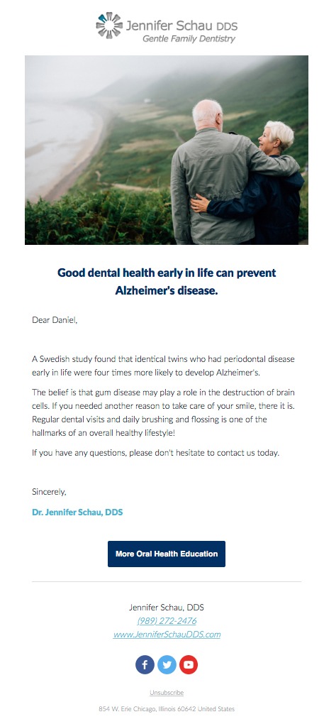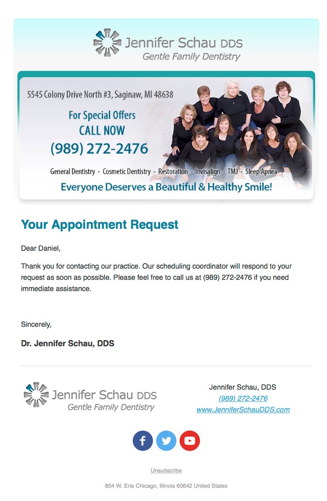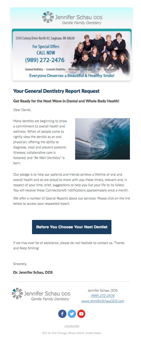 Our clients’ websites offer up to 12 Special Reports on such topics as “The 5 Things You Must Know Before Choosing a Dentist,” “How To Overcome Your Fear of the Dentist” and “Are Implants Right for Me?” while the Connections™ lead nurture email sequence keeps your practice in front of the prospective patient for an entire year!