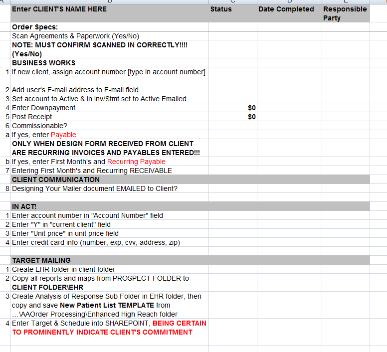 When we implement a direct mail strategy for a client, we open a Client Processing Checklist and Target & Schedule. To view modified versions of these for you to use click here and here.